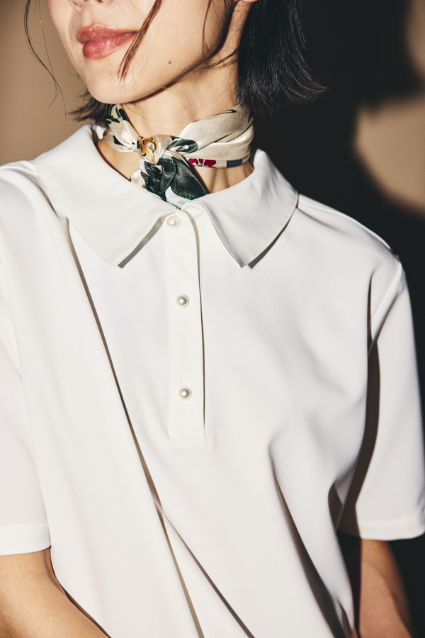 そんな人気のPolo Shirtがブラッシュアップ。既存のオールネイビーに、パールボタンになったネイビーとホワイトが加わました。パールボタンのタイプはアクセサリー要らずの華やかさがあり、第一ボタンを外したときのシックな抜け感は秀逸です。首元にスカーフをプラスするのも素敵。