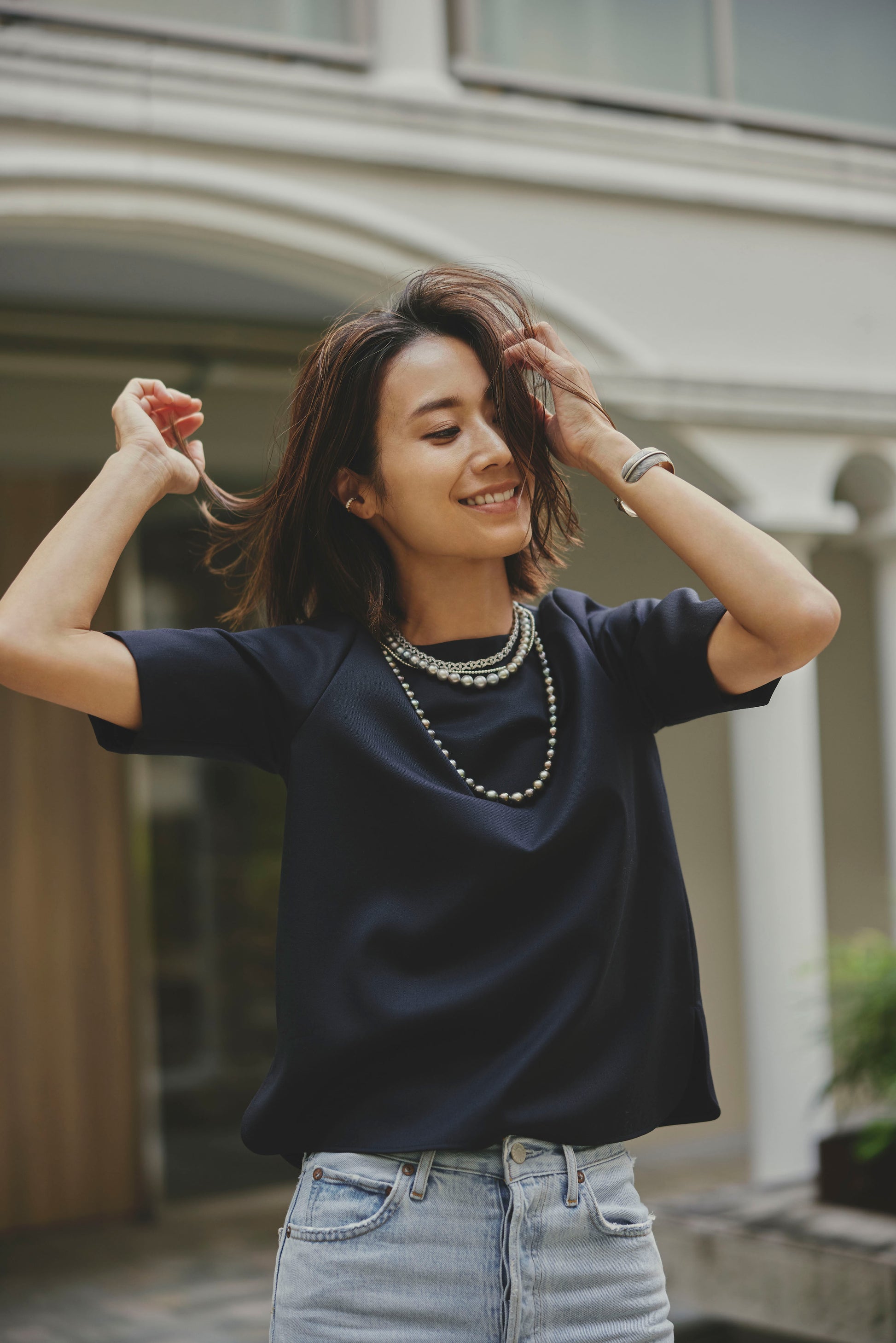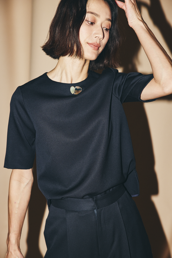 首元の開きは、ドレスよりも詰めて。こちらは一般的なネックレスが生地のうえにしっかりと乗るイメージ。ジャケット合わせの際、首元の見え方がドレスとトップスで異なり、その違いもまた着こなしを楽しむエッセンスに。